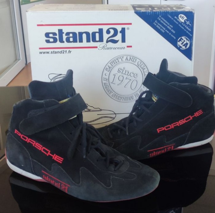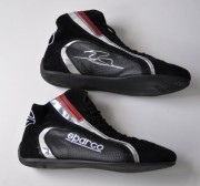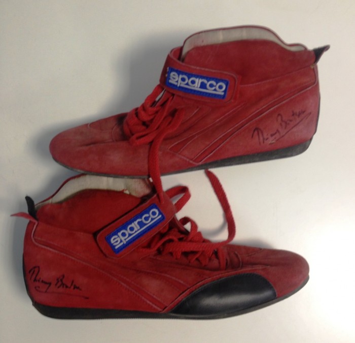 Chaussures et paire de gants dédicacés de Thierry Boutsen, ancien pilote automobile belge francophone, ayant notamment remporté plusieurs victoires en F1 (1983 à 1993) et en endurance (1981 à 1999).